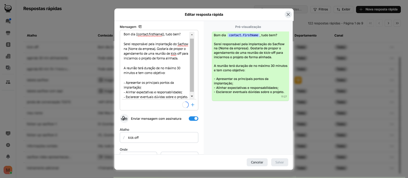 Respostas rápidas são mensagens pré-definidas que ajudam a otimizar o atendimento ao cliente, garantindo agilidade e consistência na comunicação. Com elas, é possível responder perguntas frequentes de forma eficiente, sem precisar digitar a mesma resposta repetidamente.